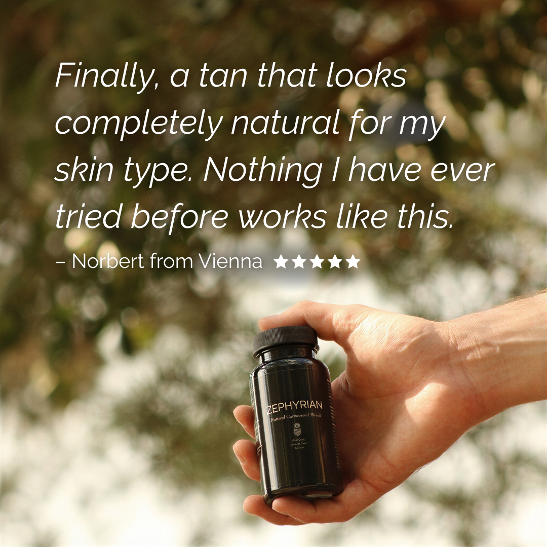 About the safest option you can choose for tanning and skincare. Instead of covering your face with synthetic ingredients derived from the petroleum industry, or damaging your sensitive skin with the UV rays of a solarium, Zephyrian works from within. It acts as an extension of a healthy diet, making you look healthy and desirable.